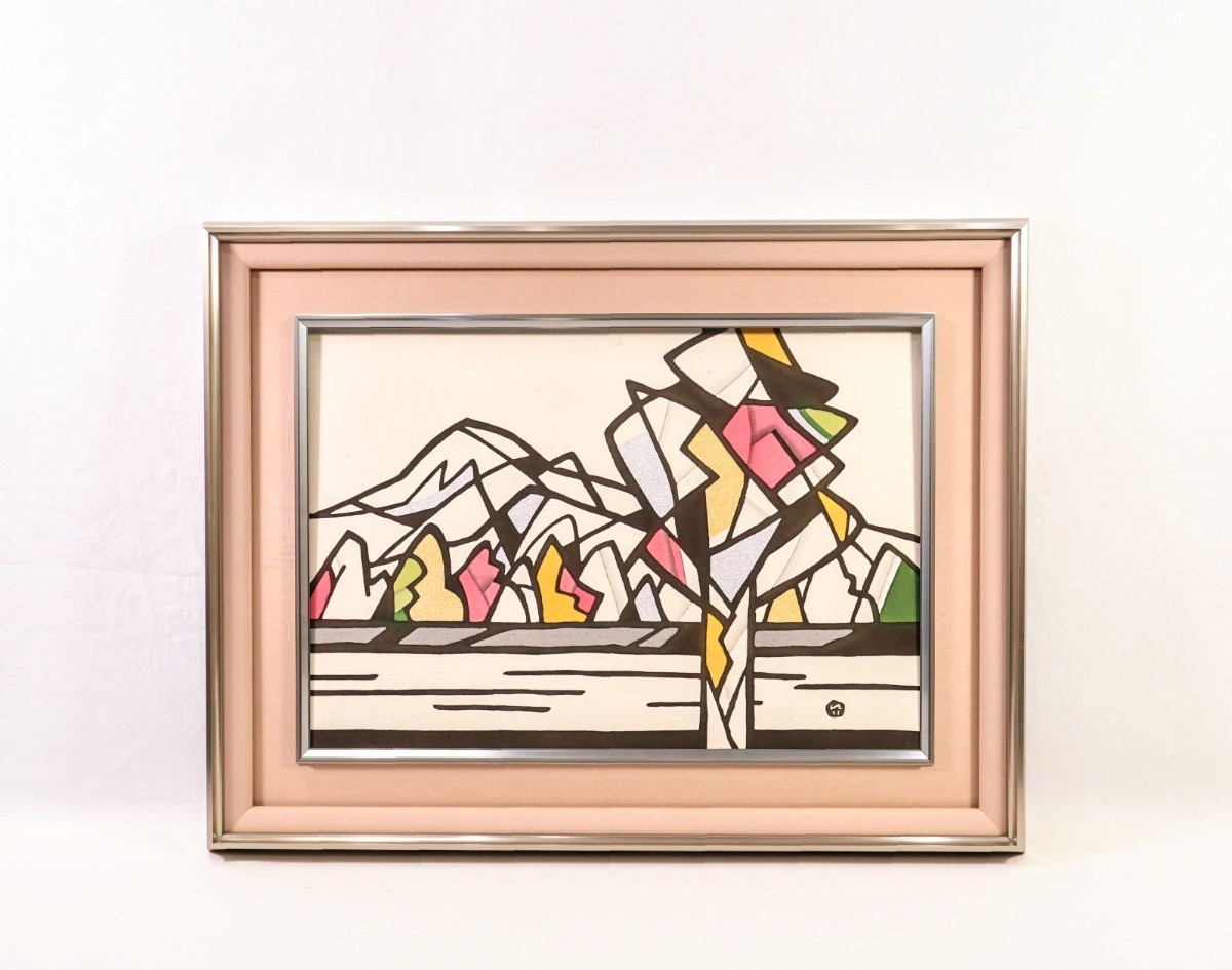> 真作 岸田竹史 染色「風景」画54×38cm 京都府出身 羽田登喜男の子、羽田登や丹下雄介など輩出 日本画の作風でモダンかつ独自の世界観 8321