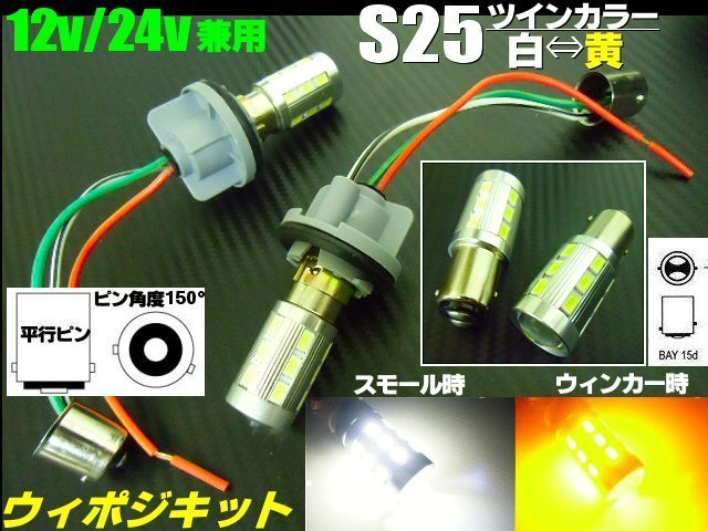 > トラック可 12V 24V 兼用 改良型 ウイポジ ツインカラー バルブ S25 ピン角150°ソケット LED 白 黄 ウインカーポジション キット