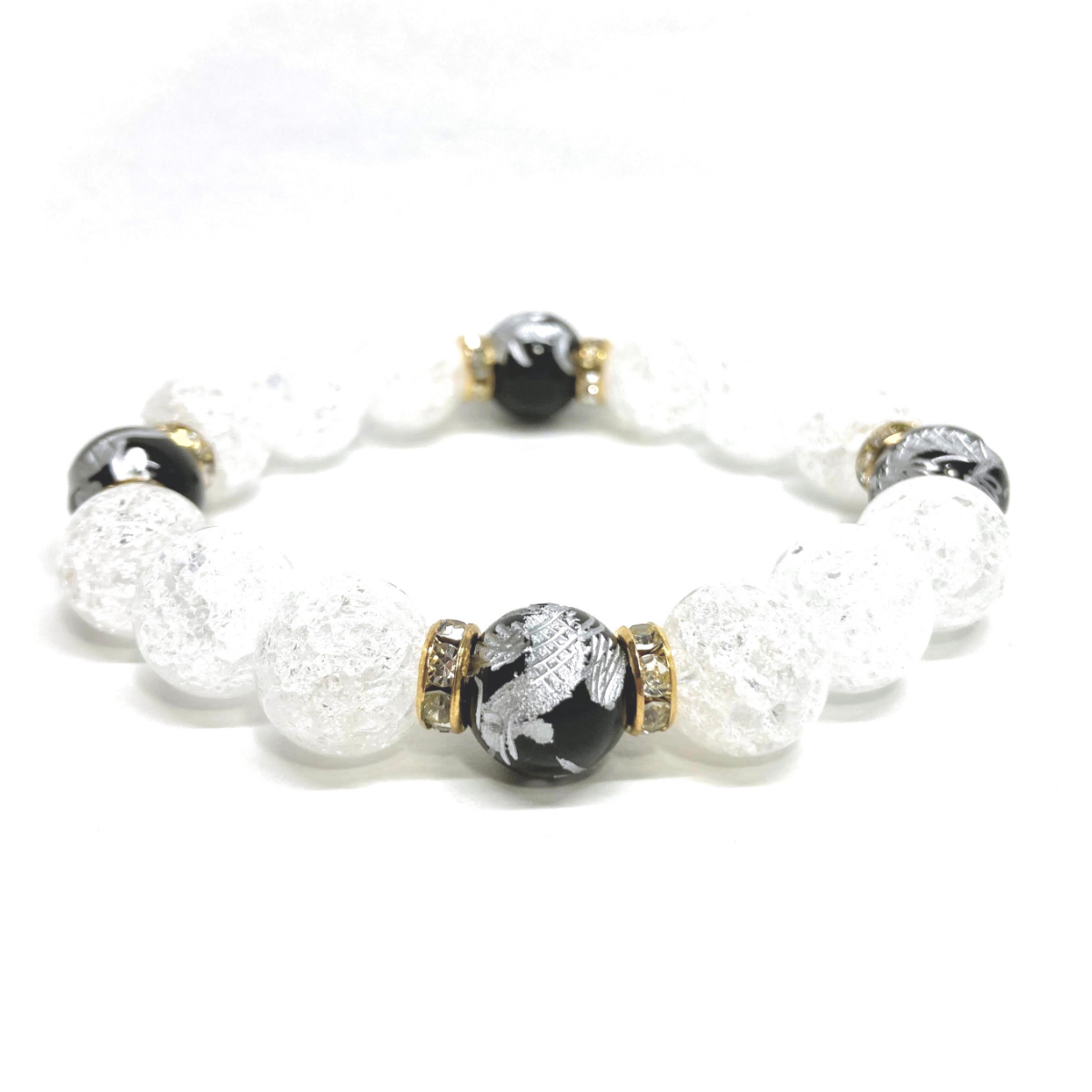 - 四神獣銀彫オニキス×クラック水晶 12mm パワーストーン ブレスレット天然石 青龍 白虎 玄武 朱雀 運気上昇 開運 金運 お守り 四神相応 G