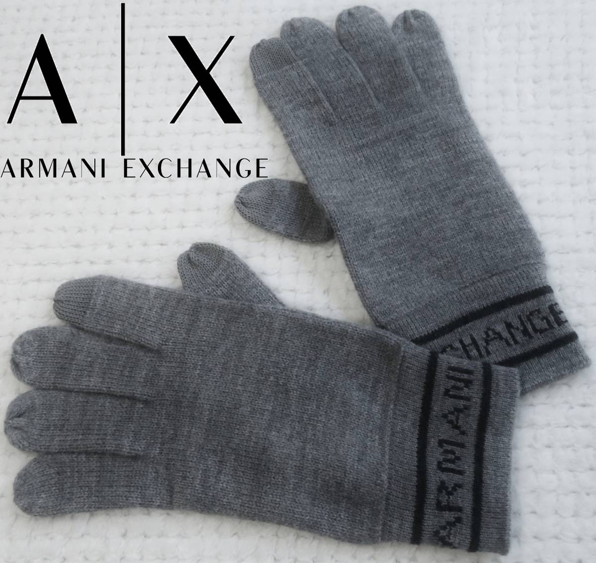 > 新品★アルマーニ★手編み風 グレー杢 ニット 手袋★ブラック ロゴ 織込み★保温 軽量 快適★ニットグラブ★AX ARMANI☆466