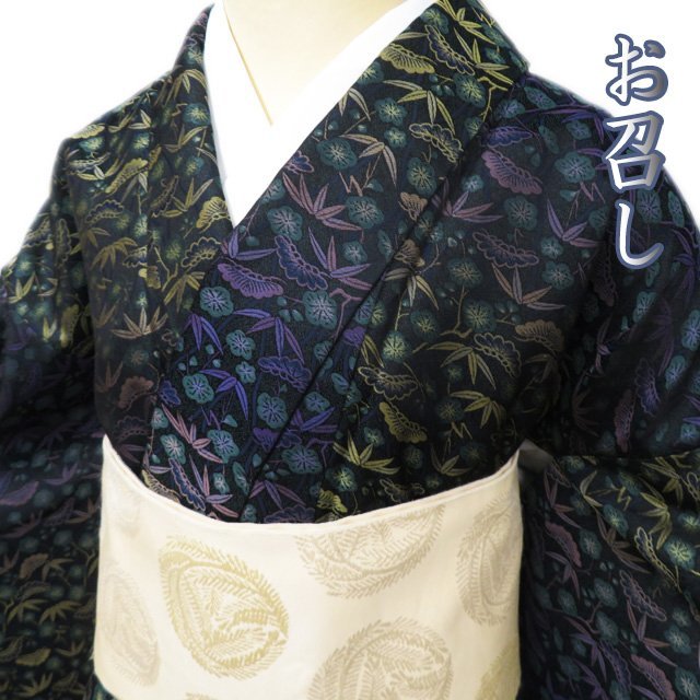 > 特選 お召し 御召 着物 中古 正絹 袷 カジュアル 吉祥文様 松竹梅 黒色 緑色 多色 身丈159cm 裄66.5cm M きもの北條 A968-5