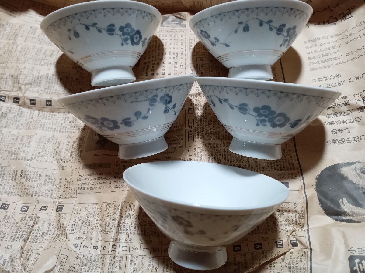 - 【旧家の蔵から】昭和中期 5客揃え 茶碗 梅模様銀線 染付 白磁器 骨董品 食器 陶磁器 焼物 お茶碗(1) |012124