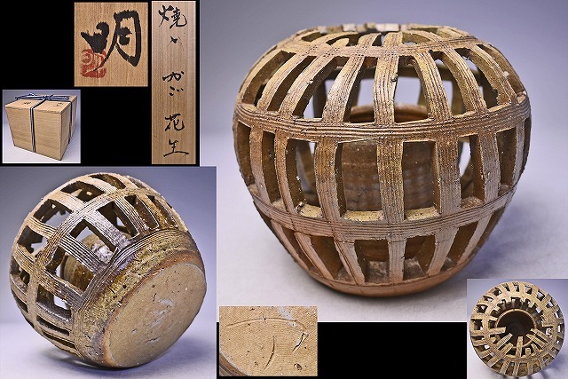 - 吉田明 ★ 焼締 かご 花生 ★ 共箱 ★ 北大路魯山人 氏の作風を思わせる造形 ★ 備前風 ★ 口に数か所折れ欠け有り ジャンク品 ★