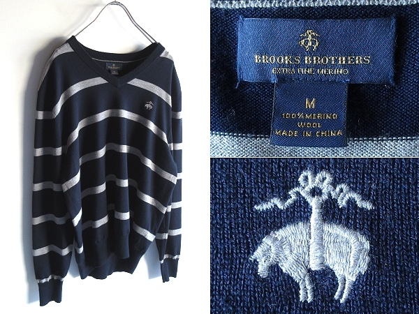 > 美品 BROOKS BROTHERS ブルックスブラザーズ ゴールデンフリース/羊ロゴ刺繍 メリノウール Vネック ボーダーニット M ネイビー グレー 紺灰