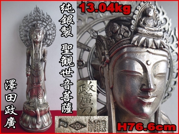 > 【真作】■純銀 造幣局ホールマーク 13.04kg (13040g)■澤田政廣【聖観世音菩薩】大型 H76.6cm 中空■観音菩薩 観自在菩薩 仏像 沢田政広■
