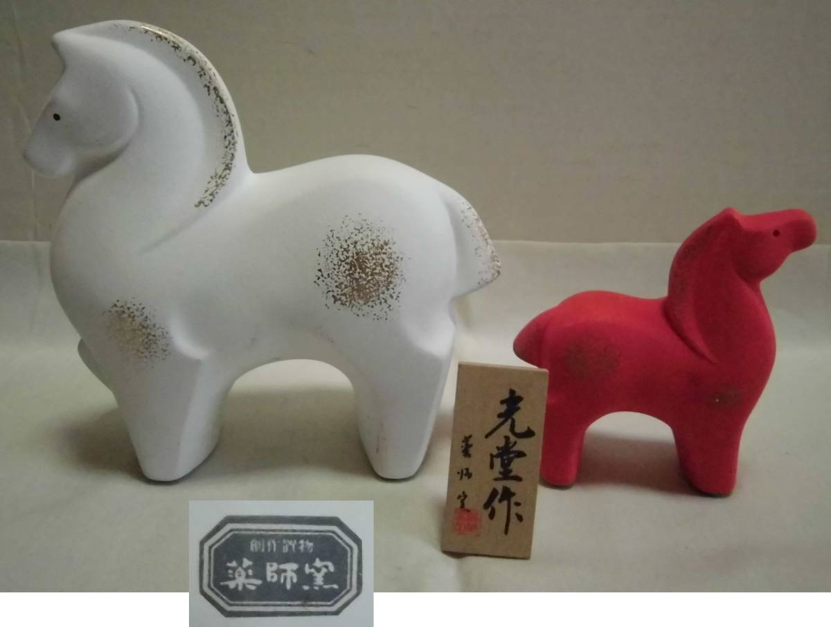 - 干支置物 午 光堂作 薬師窯 白と赤2体 金彩 馬 うま 陶人形 土人形 招福 開運 縁起物 飾り物 陶器 工芸品 レトロ