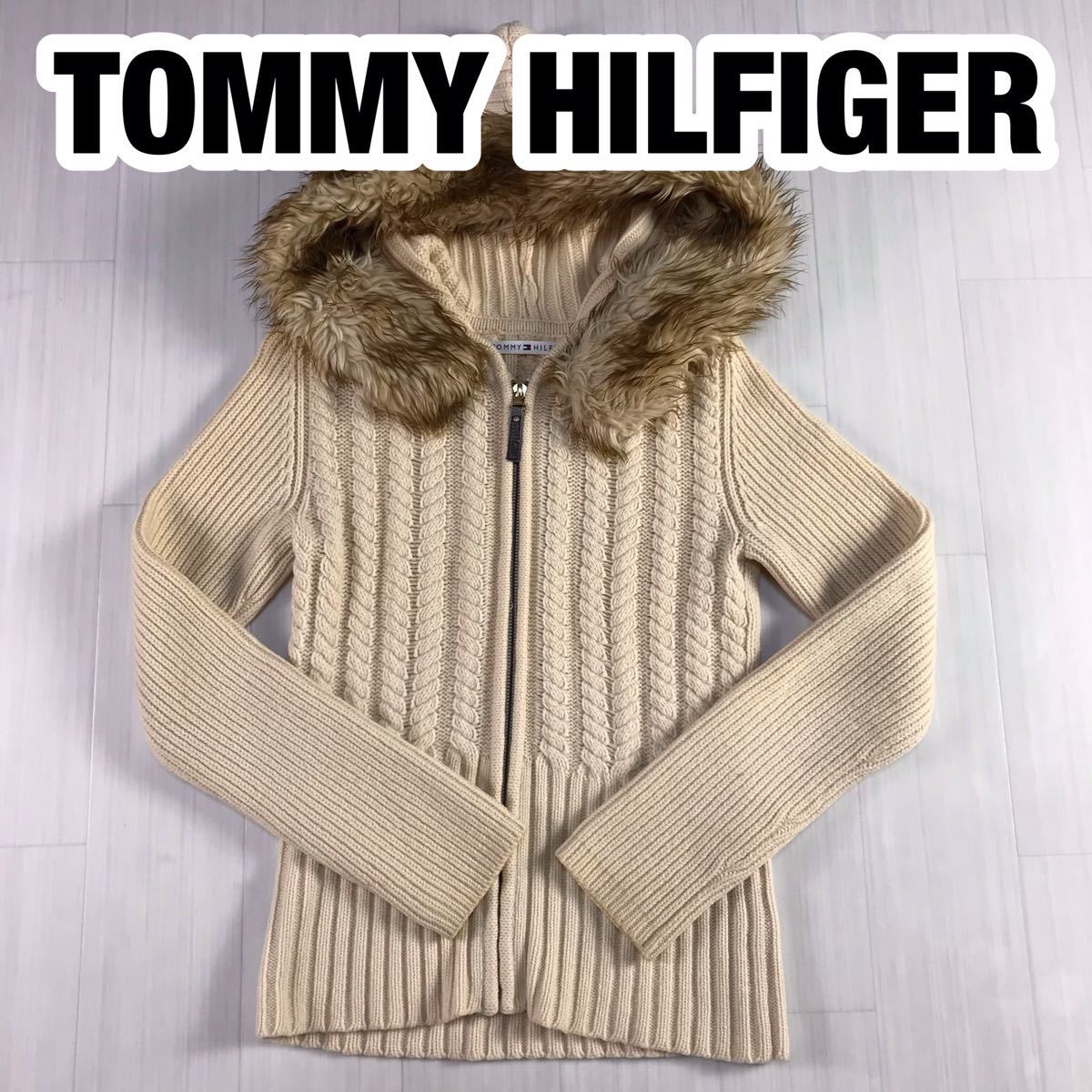 - TOMMY HILFIGER トミー ヒルフィガー ジップアップケーブルニット ラムウールニット S/P ファー付フード アイボリー フード取り外し可能