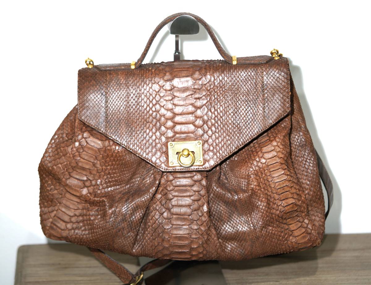 > ★イタリア製 BESOZZI FRANCO パイソンレザー 本蛇革 2WAY ハンドバッグ ショルダーバッグ 鞄 ブラウン 高級感