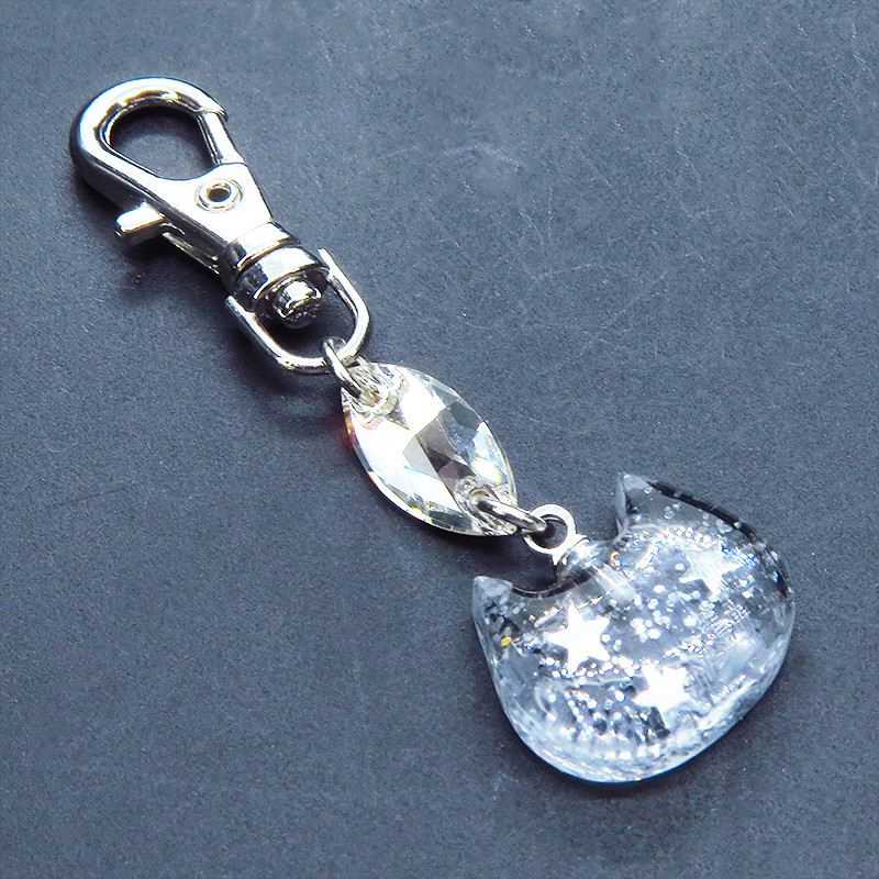 - クリアな猫フェイスチャームとスワロフスキーのキーホルダー シルバーカラー バッグチャーム 金具変更可