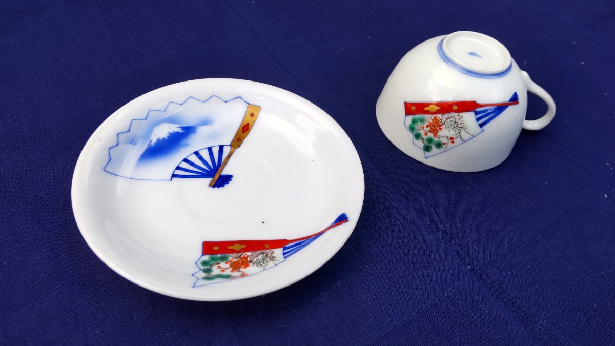 > オールド深川 カップ&ソーサー 扇面に富士と松竹梅 薄手の硬質磁器 推定明治期