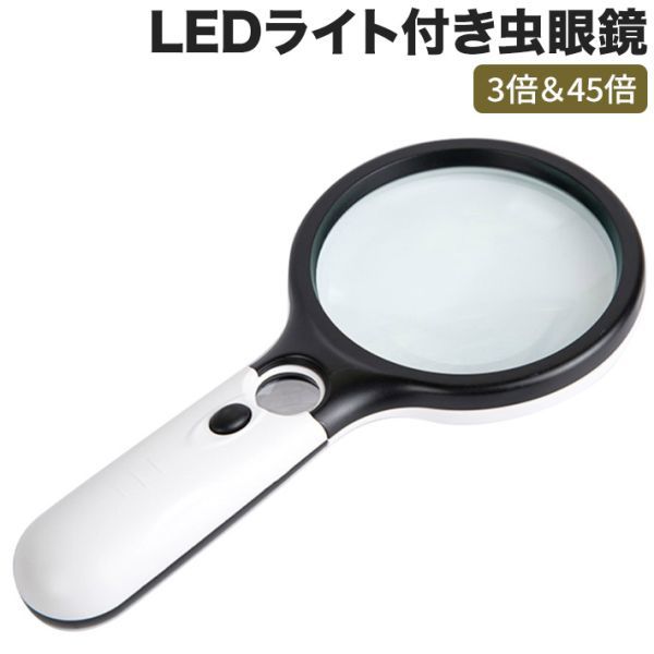 - 手持ちルーペ 3個LEDライト付き 虫眼鏡 拡大鏡 【3倍&45倍】2種類レンズ 直径75mm 携帯便利