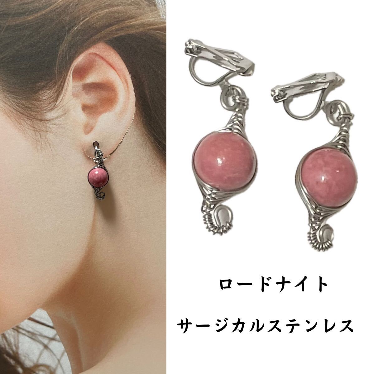 - W31. 天然石 イヤリング ロードナイト サージカルステンレス アレルギーフリー ニッケルフリー ハンドメイド