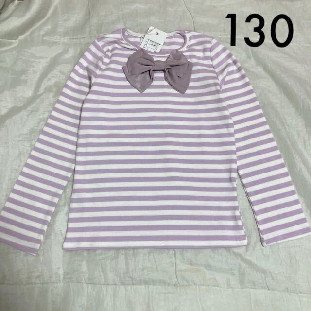 > 新品タグ付き☆韓国子供服 リボン付き長袖Tシャツ130 パープルラベンダーボーダーロンT
