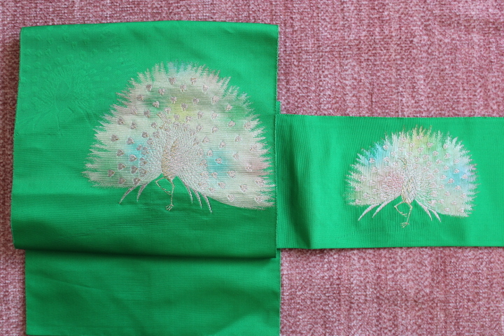 > きもの今昔6655 名古屋帯 西陣織八寸名古屋帯 正絹片緞子御太鼓と前腹に孔雀柄 帯の長さ367cm