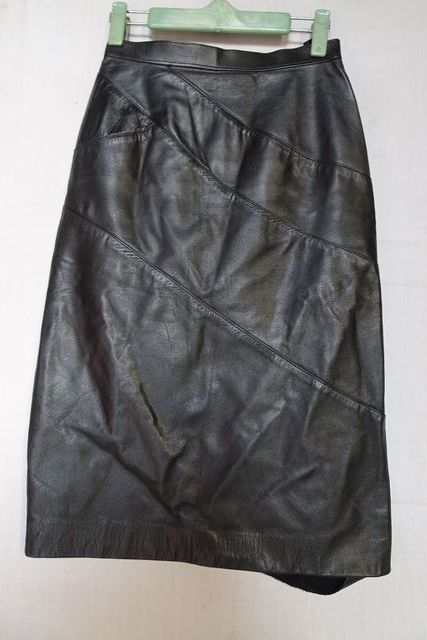 - レザースカート/タイトスカート/ひざ丈/牛革/斜め切替/後中心ボタン・ファスナー/クール/黒/ブラック/サイズ9(11/29R5)