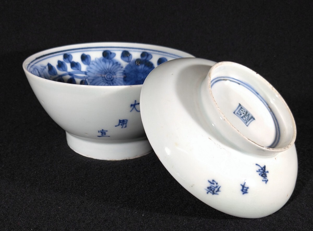 - 古い中国 清朝 染付 花文 草花文 大明宣徳年製 12cm 蓋付茶碗 中国美術 b-60a3495
