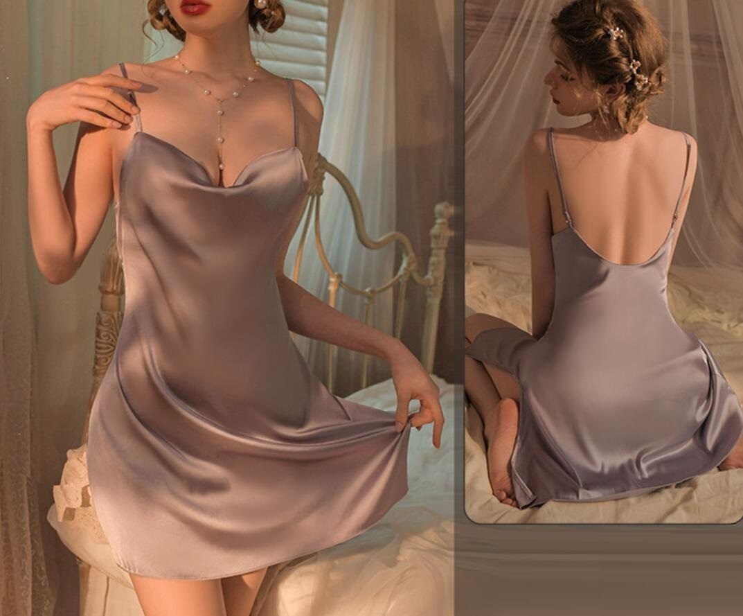 - 超セクシー 悩殺 ナイトウェア上品 寝巻き 薄い 光沢感 サテン サスペンダー ナイトドレス 快適 ホームウェア パジャマ スカート 紫