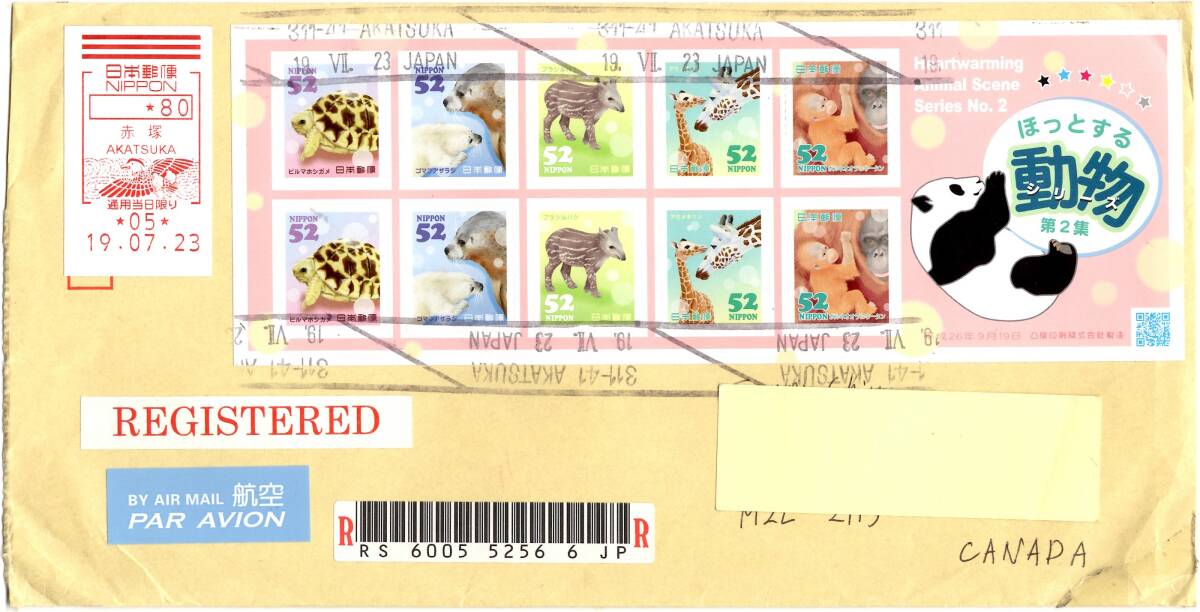 > ほっとする動物シリーズ第2集 平成27年 日本 記念 52円10種 ペーン 実逓 書留カバー カナダ宛 欧文ローラー印 使用済 切手