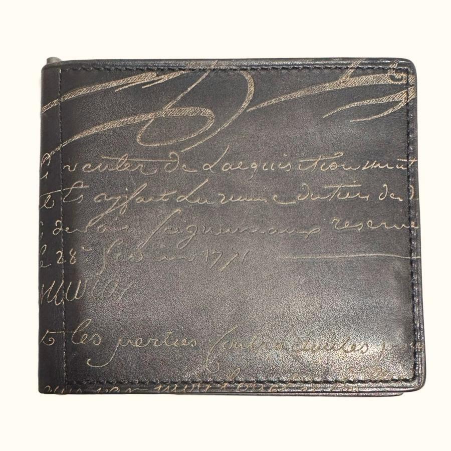 - 中古B ベルルッティ BERLUTI 二つ折り財布 マネークリップ 札入れ カリグラフィ カーキブラック メンズ 147687