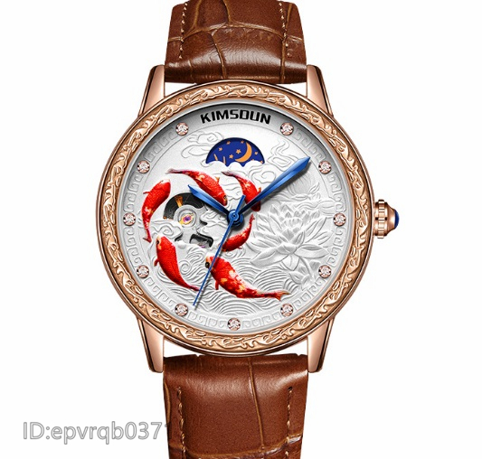 > 腕時計 新品 機械式自動巻 メンズ ウォッチ 鯉彫り トゥールビヨン ダイヤ飾り 本革ベルト 昼夜表示 柄物 紳士用 2色選ぶ/ブラウン