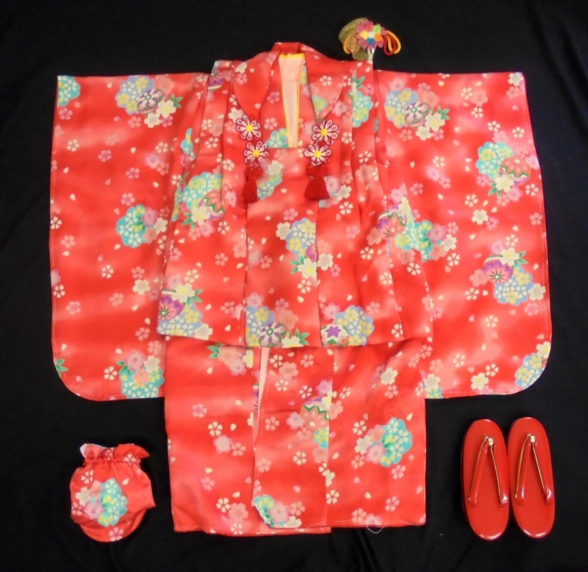 - 5614 七五三 正絹 被布セット 3歳 女の子「赤・桜/手毬」