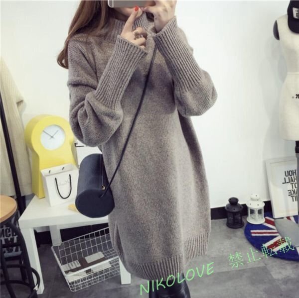 > LB948 Fサイズ 秋冬 オシャレ ハイネック ニットセーター 厚地 暖かい 20304050代 ニットワンピース カーキ