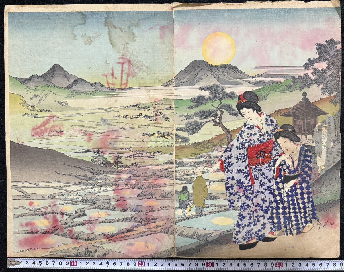 - 明治期/真作 楊洲周延 本物浮世絵木版画 名所絵 錦絵 大判 二枚続き