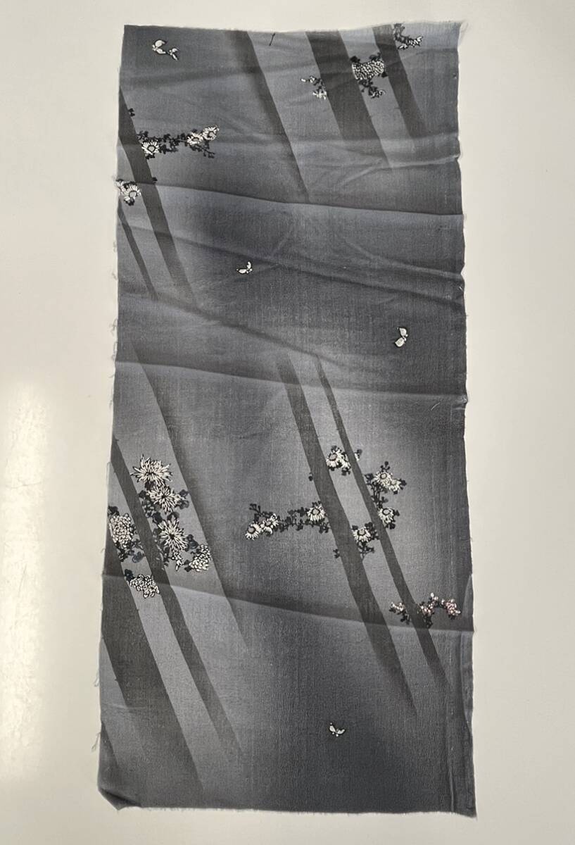 - 花とら●アンティーク端切れ 濃灰 菊 蝶 ちりめん リメイク 素材 細工用 240424-6
