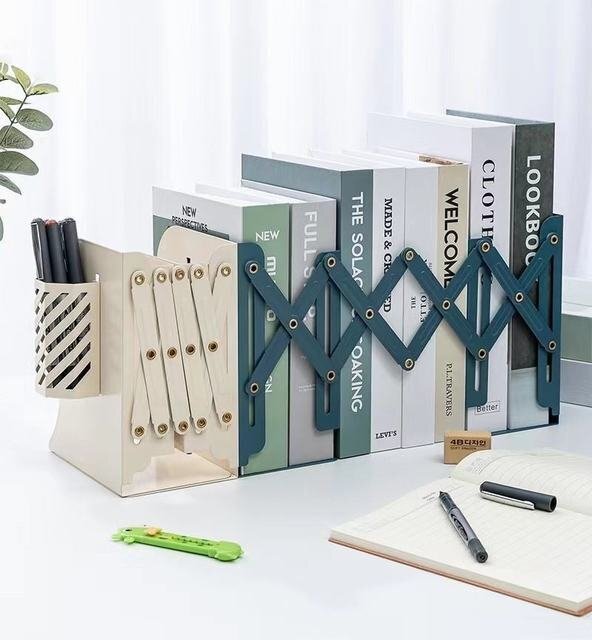- 卓上本棚 ラック 本立て ブックスタンド 伸縮自在 ペン立て付き 金属製 卓上収納 仕切りスタンド デスク整理 ダークグリーン