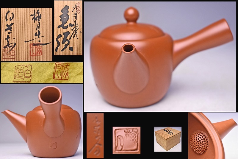- 富本梅月 ★ 谷川白道 刻 ★ 常滑朱泥急須 ★ 共箱 ★ 素晴らしい彫文 ★ 竹と梅 ★ 茶注 ★ 緻密な彫り文 ★ 煎茶道具