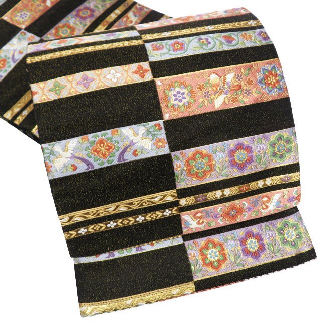 - 袋帯 中古 リサイクル 正絹 フォーマル 仕立て上がり 全通 花鳥模様 箔糸 黒色 多色 金 きもの北條 A1023-11
