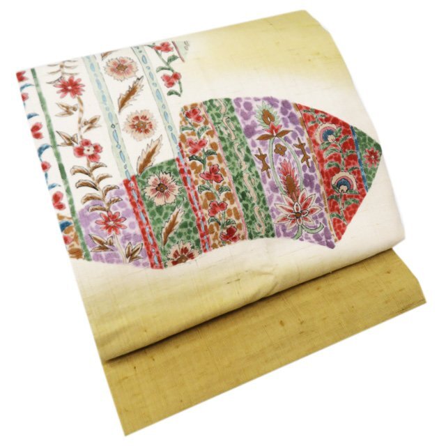 > 名古屋帯 なごや帯 中古 リサイクル 正絹 紬地 カジュアル 仕立て上がり 三越扱い 花の図 麦藁色 多色 きもの北條 A1026-7