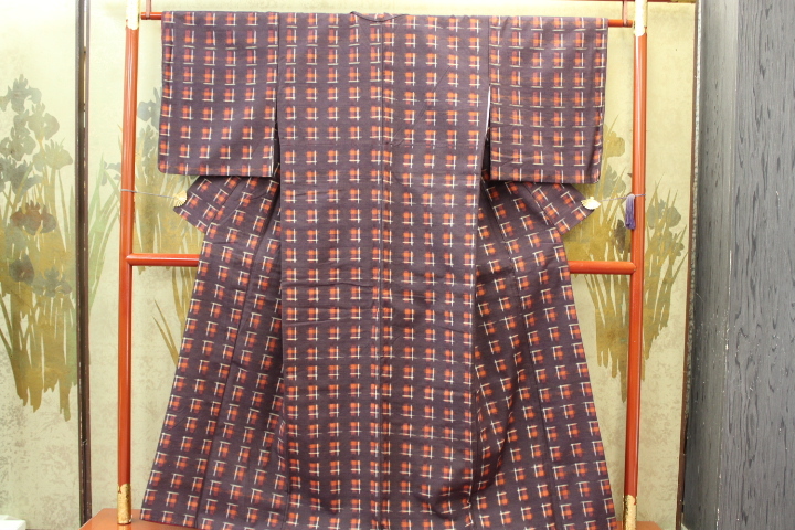 > きもの今昔7062 紬のきもの 広衿袷手縫い仕立 ネップ感のある紬の絣柄 焦げ茶色地色 着用感なし 身丈155CM