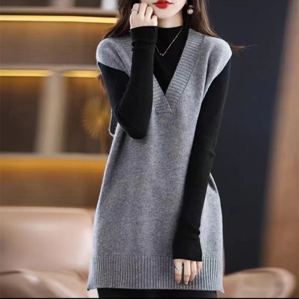 > 新品 / ニットベスト ニットセーター Vネック ロング丈 ニットトップス 袖なし おしゃれ 可愛い レディース チョッキ / グレー