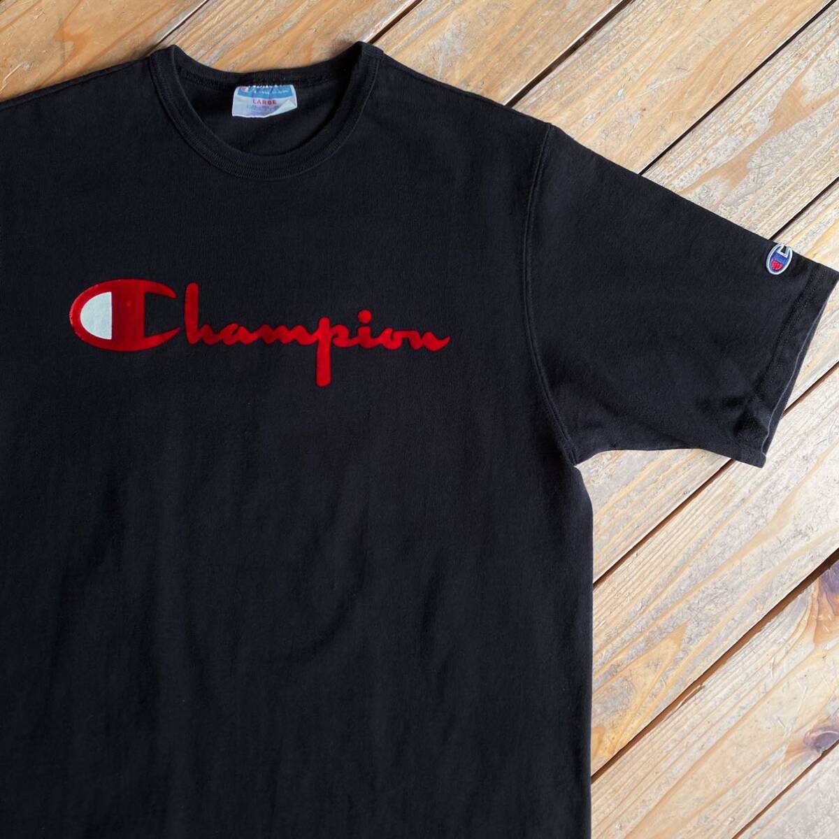 - USA古着 チャンピオン Champion メンズ Lサイズ ブラック アメカジ スポーツ 夏物 インナー カットソー 丸首 ビッグプリント T2621
