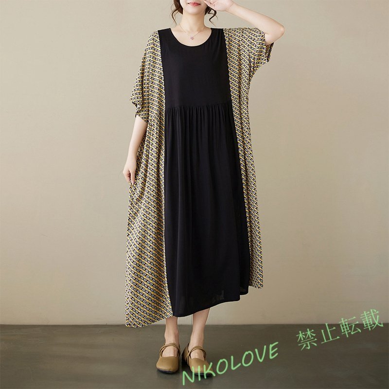 - 新品ゆったりビッグサイズ ファッション 丸首 切り替え 半袖 ワンピース ブラック LE447