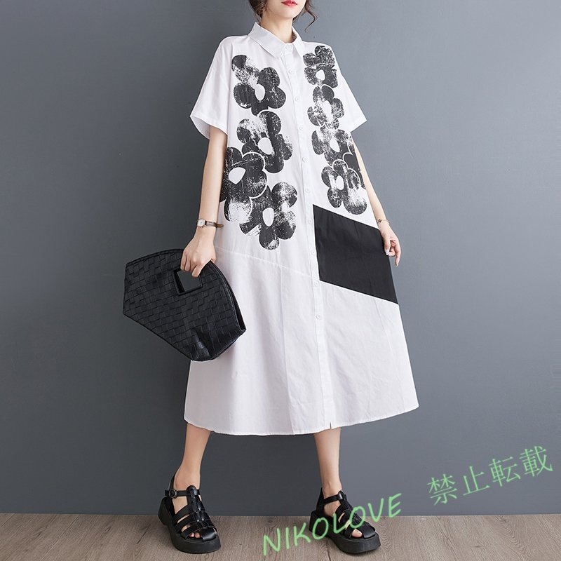- 新品レディース ゆったり大きいサイズ カジュアル体型カバー 花柄 半袖ロングシャツワンピース 白 LE788