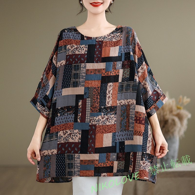 - 新品ゆったり大サイズ カジュアル 丸首 レトロ 不規則 幾何柄 ちいさな花柄 七分袖 コウモリ袖上着 黒系 LH362