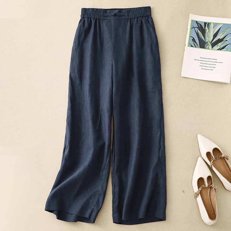 - 夏新品* ワイドパンツ レディース きれいめ リネン パンツ フレア ワイドパンツ ウエストゴムパンツ 麻混 涼しい ボトムス*ネイビー