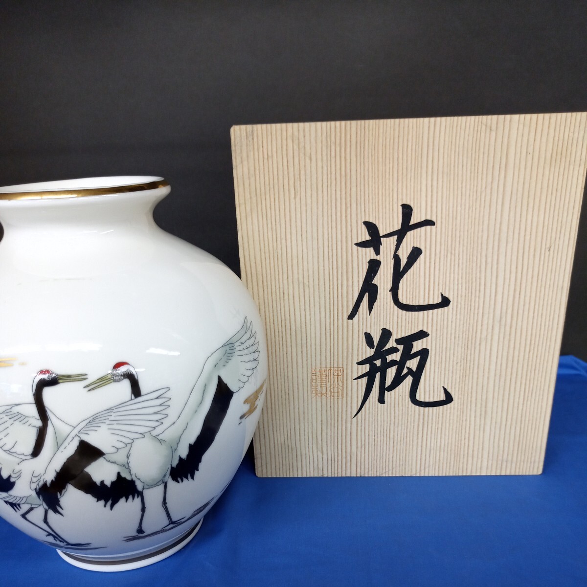 - 昭和レトロ■ホヤクリスタル つるの舞 花瓶大 義孝 hoya 花器 フラワーベース 金彩