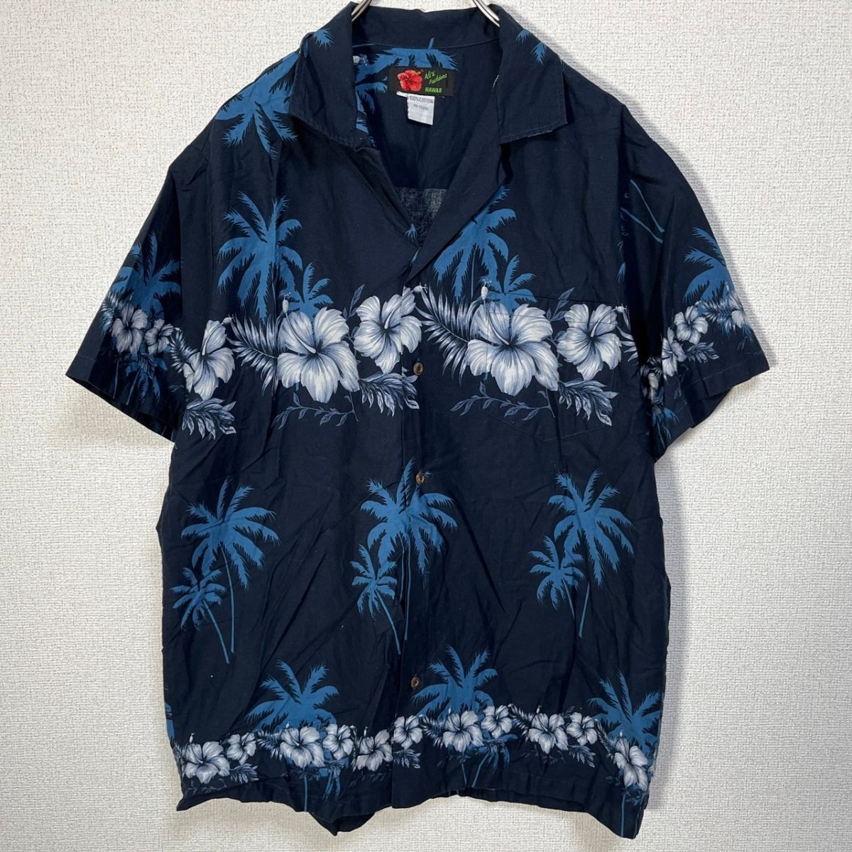 - アロハシャツ 半袖柄シャツ 総柄花柄 ネイビー ヤシの木 ハイビスカス75 古着 入手困難 激レア 希少 人気 ボタニカル 胸ポケット