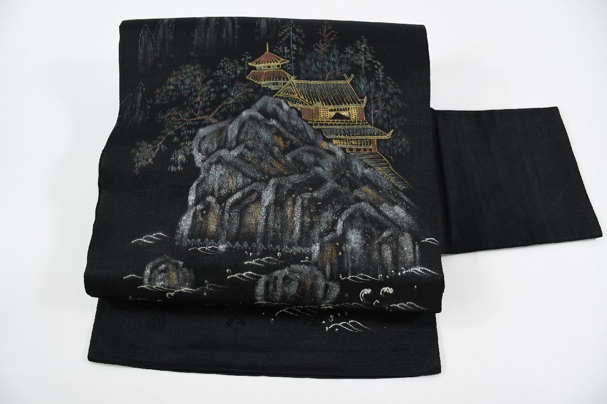 - 名古屋帯 アンティーク 手描き 風景 帯丈316cm ★着物屋 ne-10708 桜庭呉服店