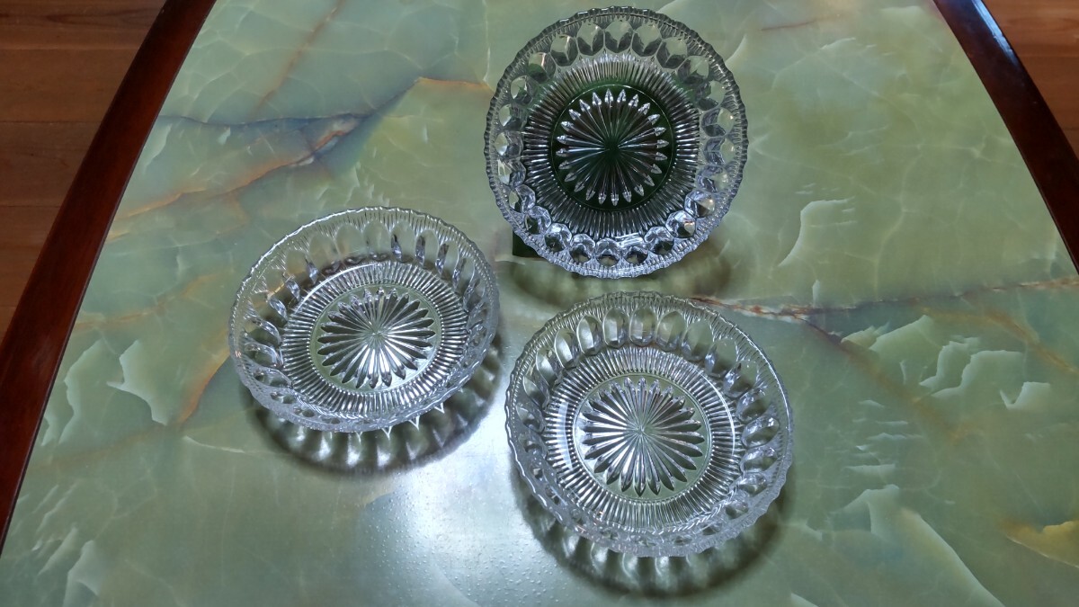 - 昭和レトロ プレスガラス 小皿3枚 菊文 サイズ[直径14㎝高さ3.3㎝重さ250g]
