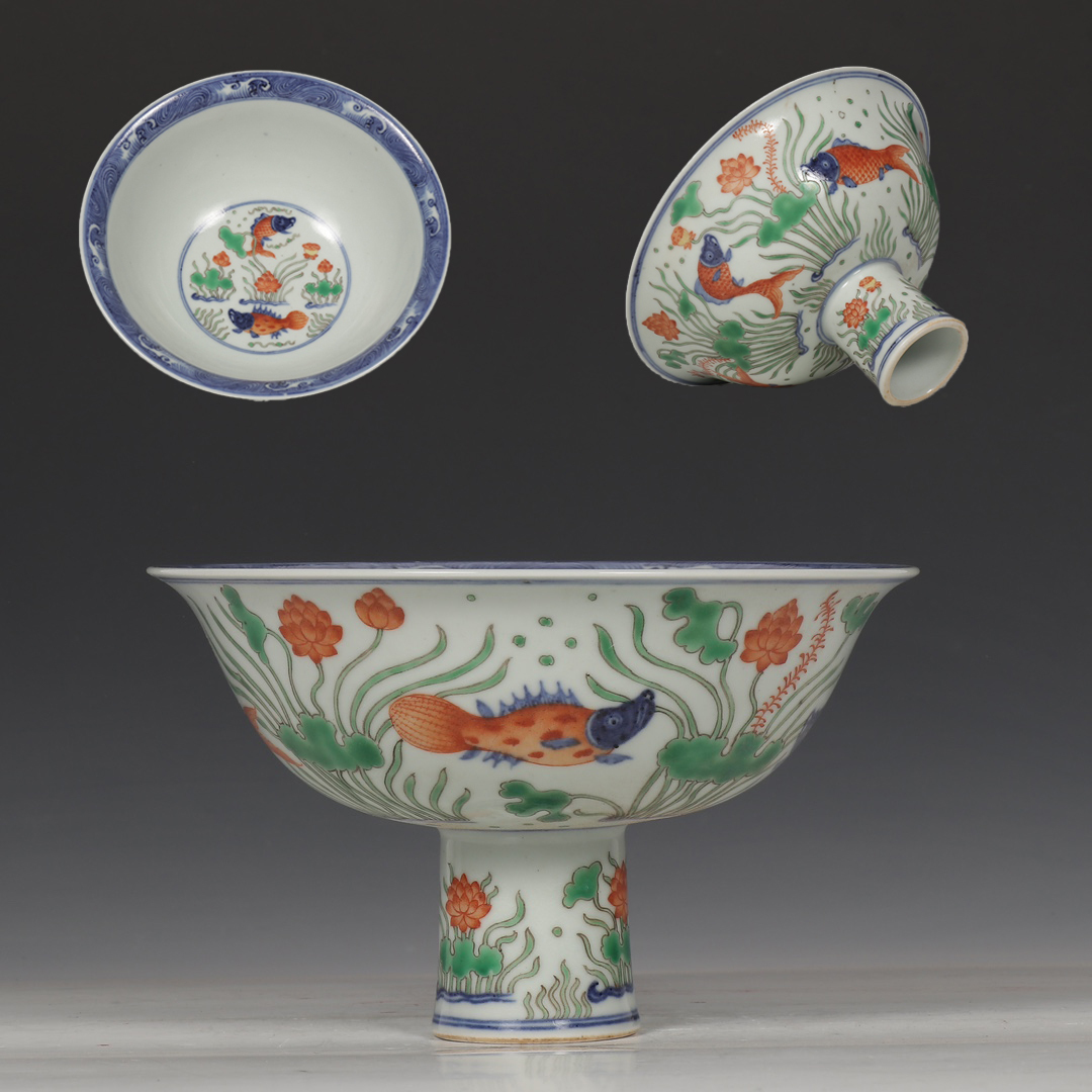 - 旧藏 宣徳年製款 青花五彩魚藻蓮池文高足杯 唐物 箱付き 陶磁器 中国美術 珍品 置物 賞物 RG85