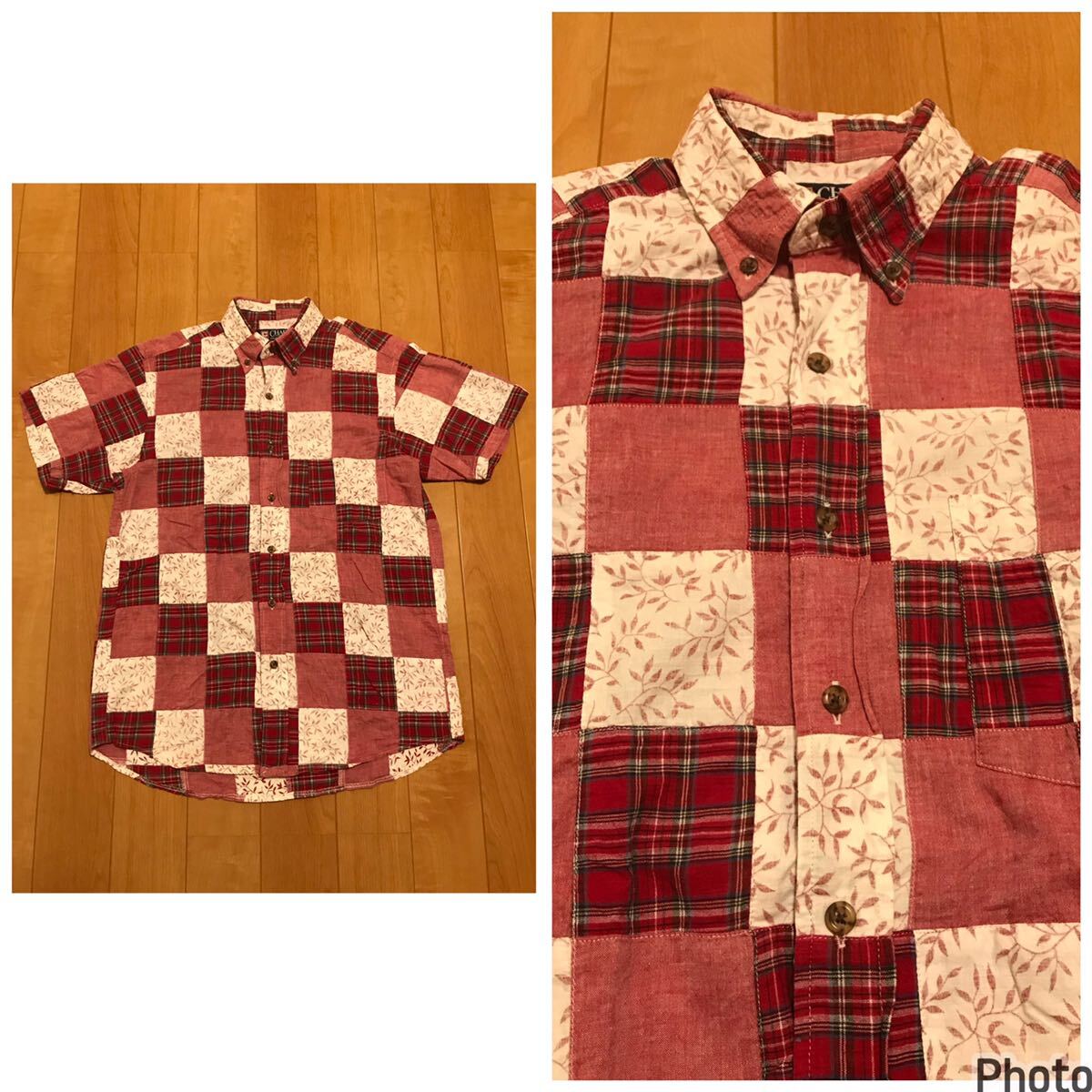 - 美品☆ラルフローレン.CHAPS メンズサイズ S大き目 インド綿.パッチワーク半袖BDシャツ 葉柄裏使い地&タータンチェック柄&シャンブレー地