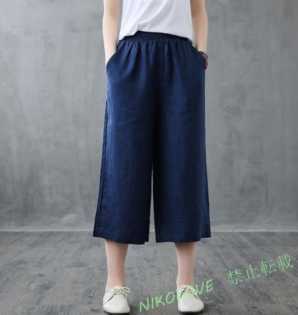 - 新品 リネン 麻混 ワイドパンツ きれいめ レディース パンツ ワイド ボトムス 楽ちん 七分丈 シンプル ウェストゴムネイビー XL LG989
