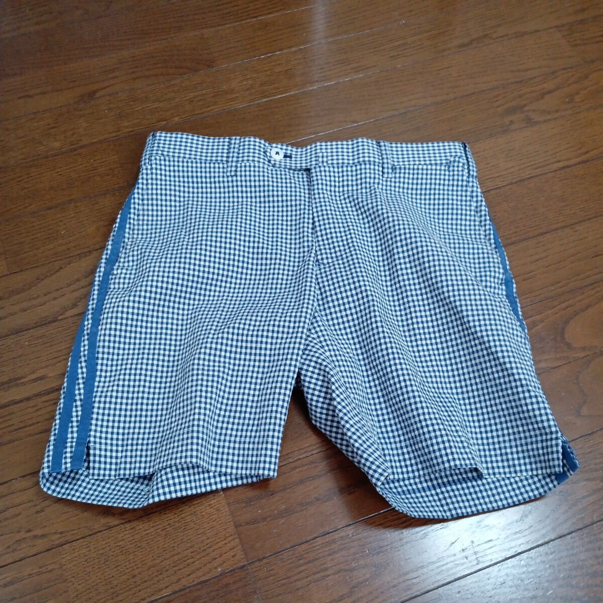 > 1411【中古】monzee golf モンジーゴルフ ゴルフウェア ハーフパンツ 白紺 チェック柄 右後ポケットに猿刺繍 メンズ サイズ S