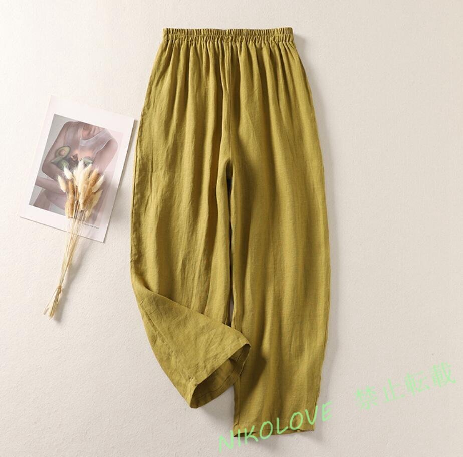 - 新品カジュアル ワイドパンツ 無地 綿麻 体型カバー ボトムス 素敵な ポケット ゆったり ウエストゴム ガウチョパンツ グリーン LH679