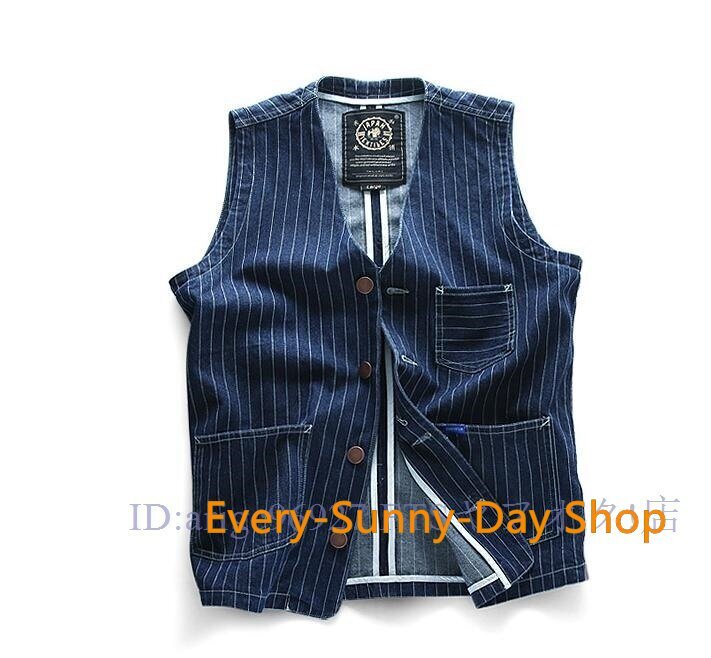 - 新品レトロ ヴィンテージ仕様 ストライプ カウボーイ インディゴ デニム ジレベスト サイズM~2XL メンズ 大きいサイズ
