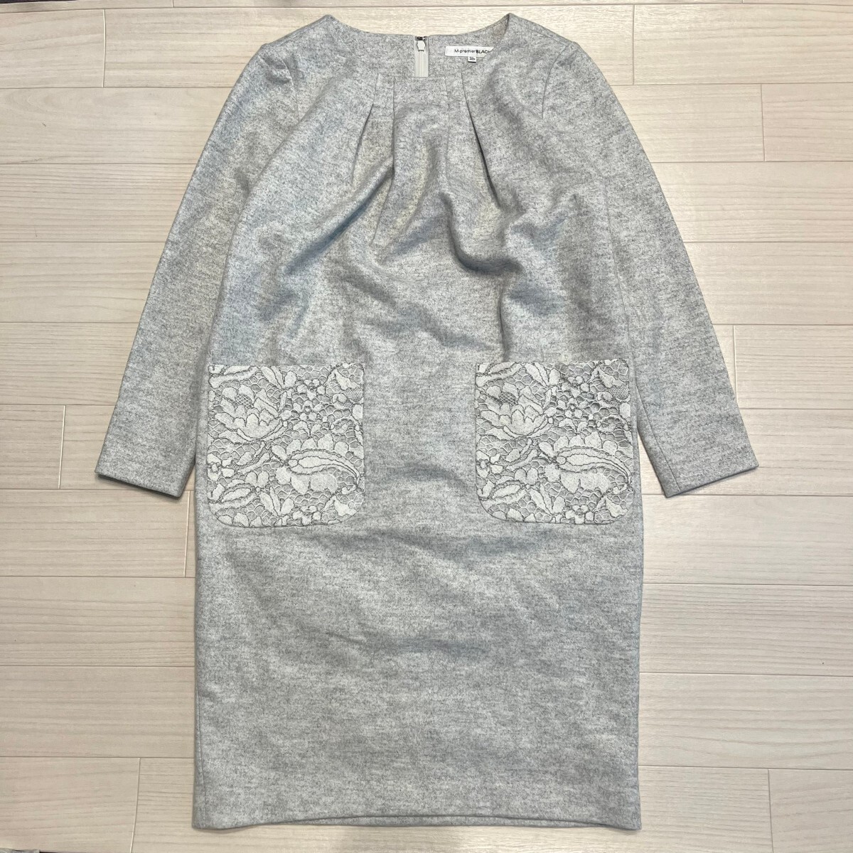- M-Premier BLACK エムプルミエブラック 毛混 Iラインワンピース レース 長袖 背面ファスナー 裏地あり ドレス サイズ32 グレー ロング